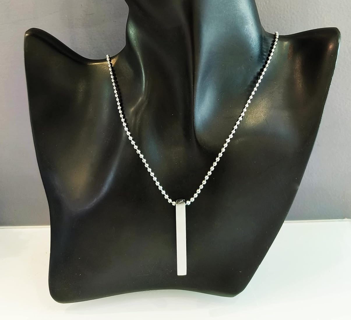 A sleek and modern bar pendant necklace crafted in polished stainless steel. Its minimal linear design and bold chain strike the perfect balance between simplicity and statement, making it a versatile piece for both casual and elevated looks. Durable, timeless, and effortlessly stylish.