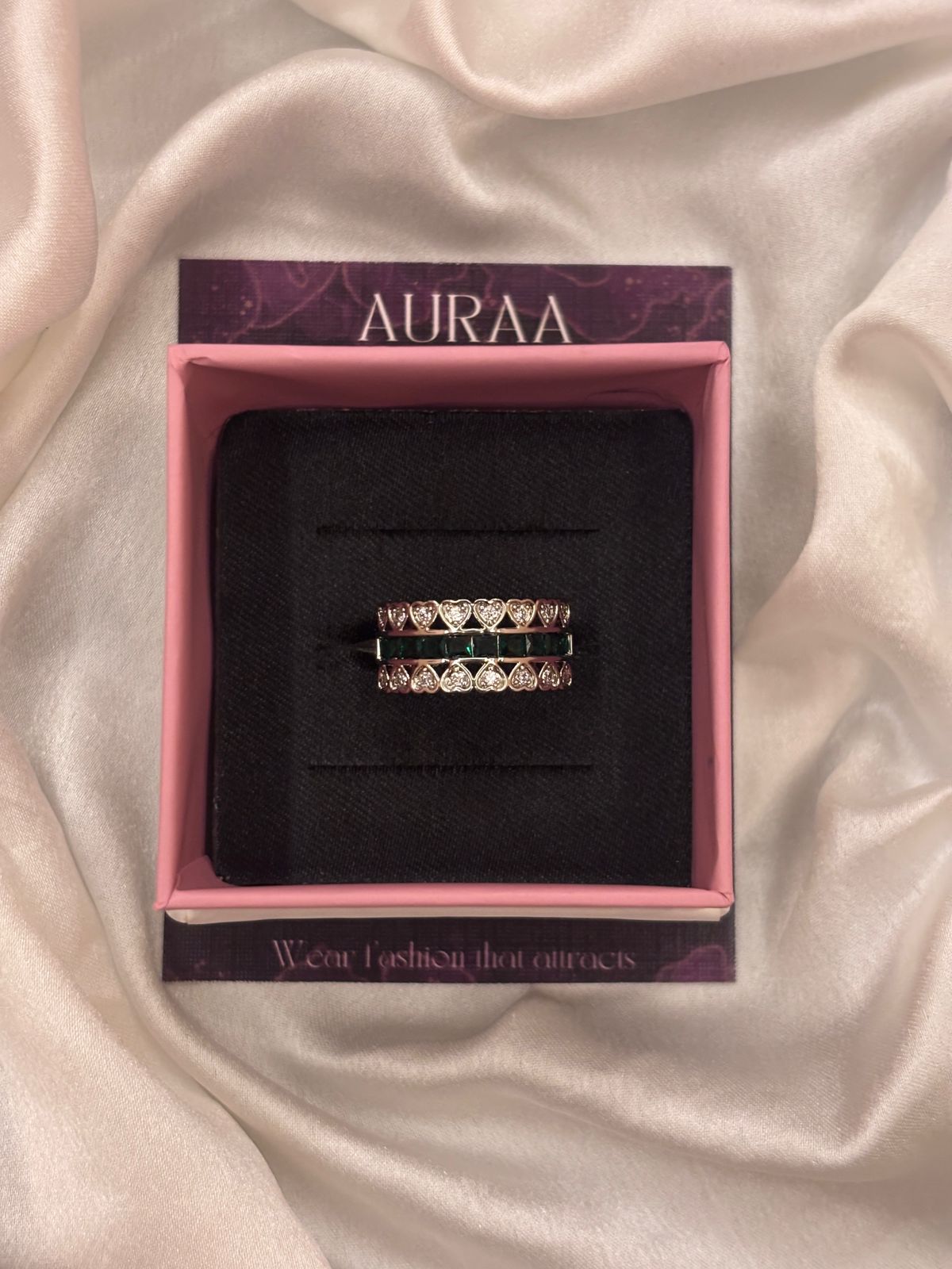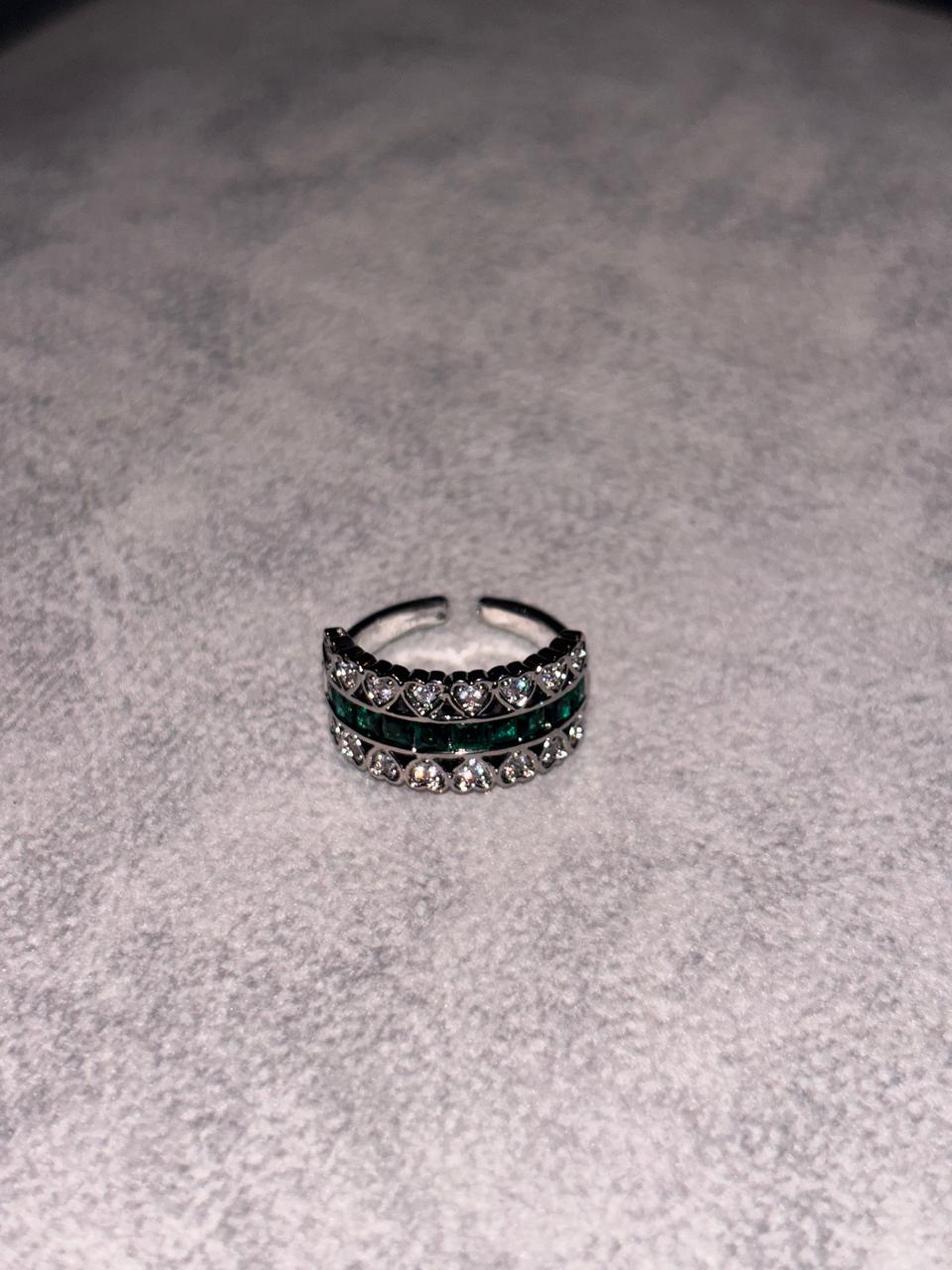 Silver Green Stone Studded Multi Hearts Copper Adjustable Ring