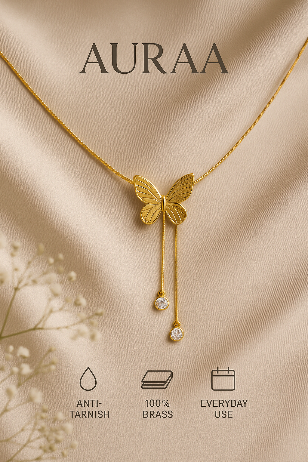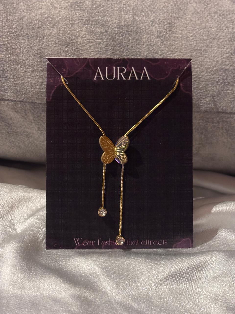 Step into elegance with Auraa’s golden butterfly pendant, designed to add a radiant charm to your look. Featuring a finely detailed butterfly centerpiece, this pendant exudes sophistication and femininity. Two sleek drop chains gracefully dangle from the butterfly, each adorned with shimmering crystal stones that catch the light with every movement. ✨ Intricately crafted golden butterfly design – symbol of beauty & transformation